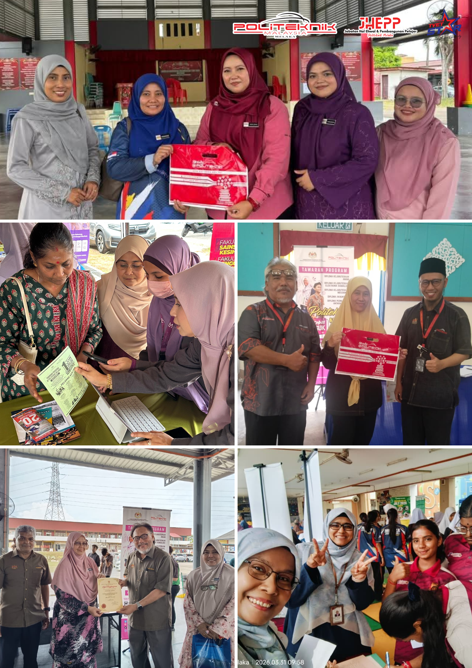 Melaka, 31 Mac 2026 - Gambar-gambar sekitar Program Outreach Promosi PMK sempena keputusan SPM 2025. Seramai 50 Pegawai Promosi telah turun padang ke 22 buah sekolah bagi berkongsi peluang melanjutkan pengajian di Politeknik Melaka (PMK).Β Terima kasih kepada semua pihak sekolah dan para pelajar atas sambutan yang sangat menggalakkan sepanjang program berlangsung.