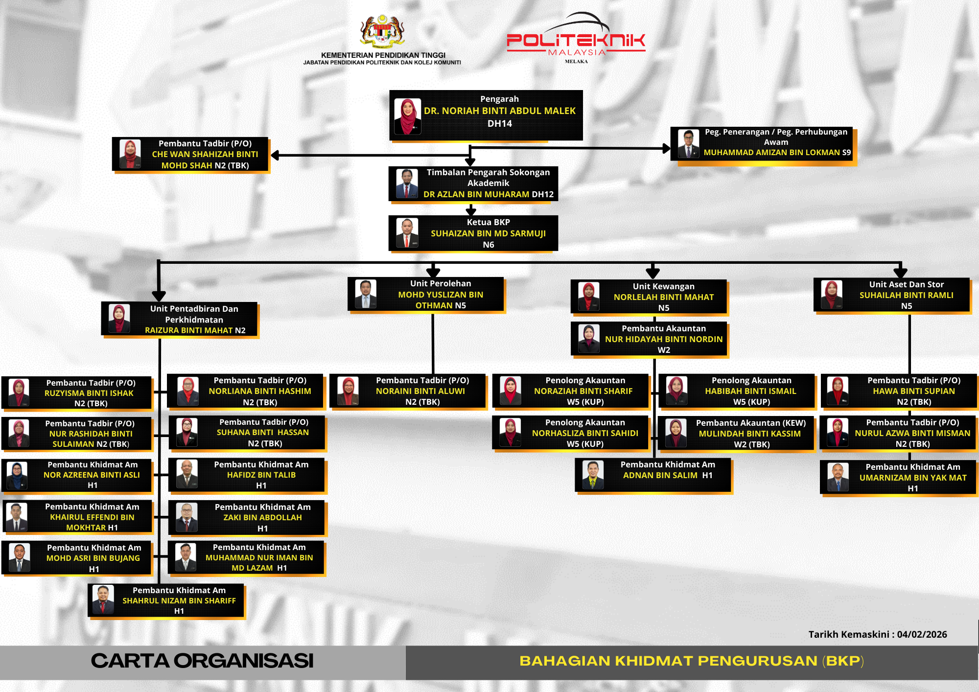 Bahagian Khidmat Pengurusan memainkan peranan penting didalam membantu pengurusan Politeknik Melaka bagi merealisasikan matlamat yang telah ditetapkan. Bahagian ini diketuai oleh Pegawai Eksekutif Kanan dan mempunyai 3 unit dibawahnya iaitu :-