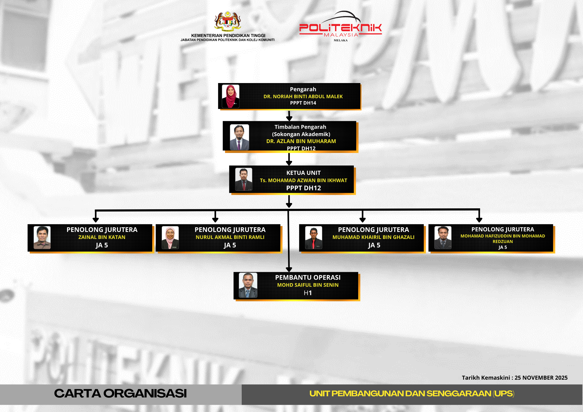 Unit Pembangunan Dan Senggaraan mempunyai staf seramai lima orang staf yang terdiri daripada seorang Ketua Unit pembangunan dan Senggaraan (DH44), dua orang Penolong Jurutera Awam (JA29), dua orang Penolong Jurutera Elektrikal (JA29) dan seorang (1) Pembantu Am Pejabat (N4) . Unit ini juga dipertanggungjawabkan dalam penyediaan spesifikasi kerja dan pelan untuk kerja- kerja penyelenggaraan dan menaiktaraf bangunan Politeknik Melaka bagi memberikan keselesaan pelanggan.