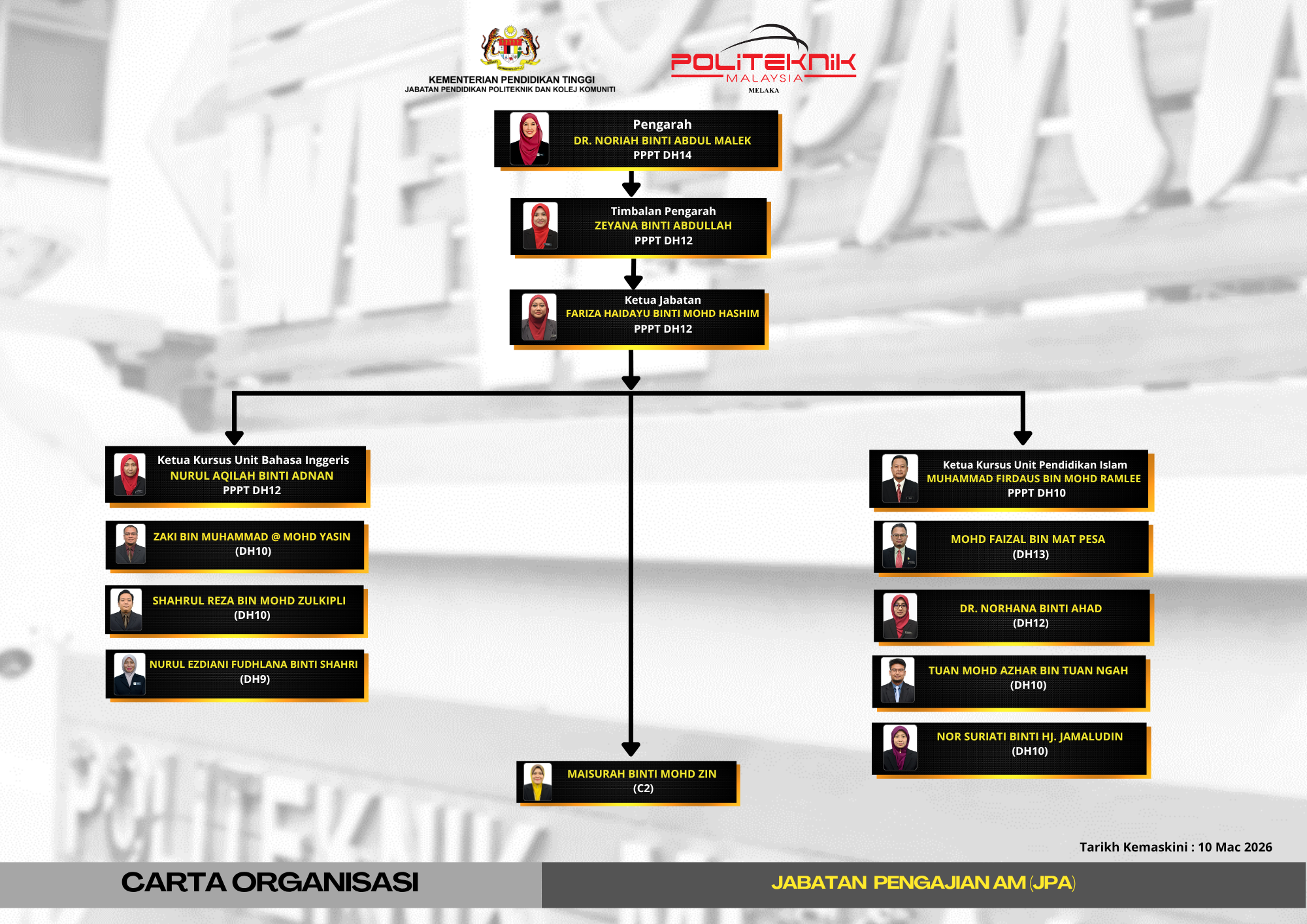 Jabatan Pengajian Am merupakan jabatan sokongan yang bekerjasama dengan empat jabatan induk iaitu Jabatan Kejuruteraan Awam, Jabatan Kejuruteraan Elektrik, Jabatan Kejuruteraan Mekanikal dan Jabatan Perdagangan. Jabatan ini memegang amanah untuk melahirkan pelajar-pelajar berwibawa yang cemerlang, bukan sahaja dari sudut kemahiran bahasa, malah pelajar-pelajar yang tinggi sahsiah, kukuh rohani dan mantap akidahnya untuk menempuh kehidupan luar.